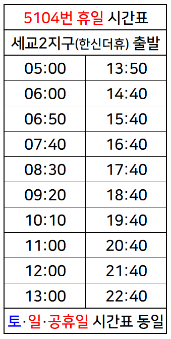 [5104]직행좌석 5104번 버스정보 시간표 (오산·세마역·을지로입구역·서울역)