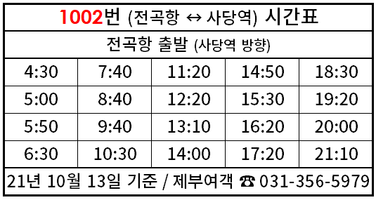 [1002]직행좌석 1002번 버스정보 시간표 (전곡항·화성시청·남양뉴타운·사당역)